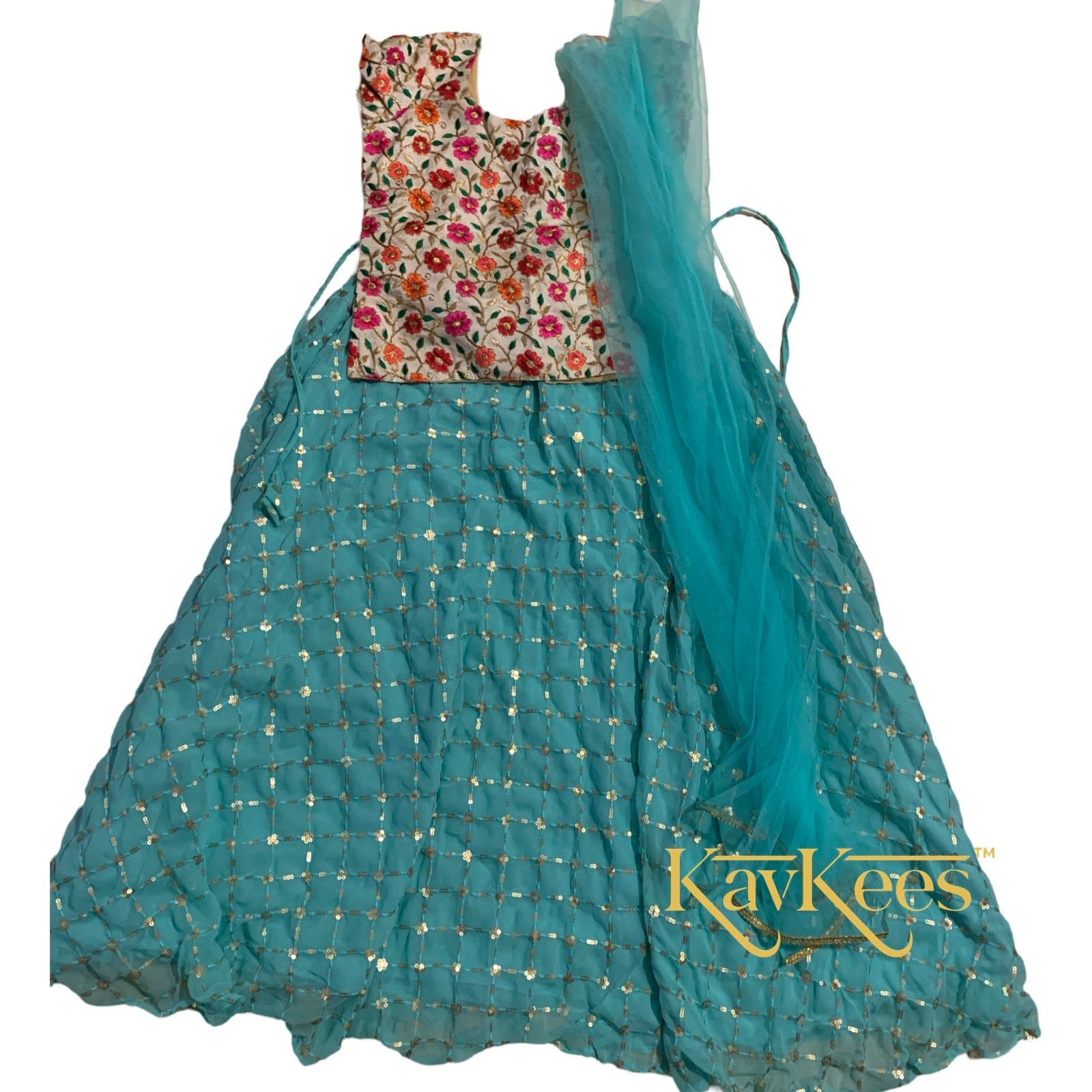 This beautiful set comes from the Gagana Collection which uses Georgette fabrics for the skirts.