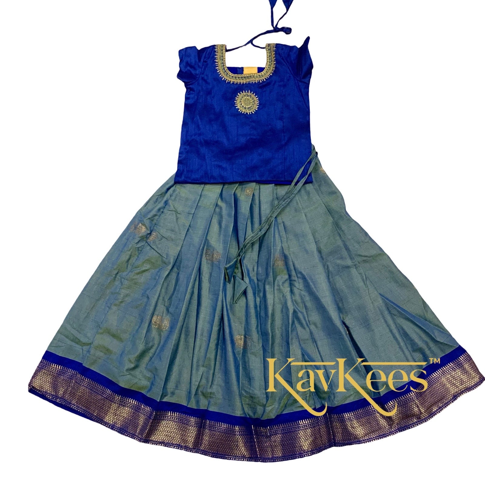 The skirt is a beautiful Paithani Silk Cotton fabric of Turquoise Green with a Sapphire Blue-Green Double Shade with Bright Blue Border Paithani Silk Cotton Skirt and Bright Blue Dupion Silk Blouse with Embroidery